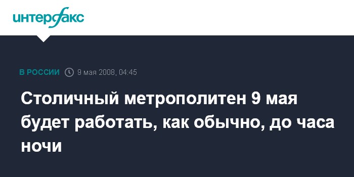 Москва. 9 мая. ИНТЕРФАКС-МОСКВА - На 9 мая не запланировано продление времени работы московского метрополитена, сообщил "Интерфаксу" начальник столичного метро Дмитрий Гаев.