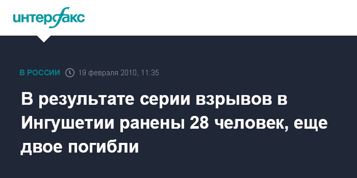 Москва. 19 февраля. INTERFAX.RU - В результате нескольких взрывов в одном из частных домовладений в Назрани два человека погибли, 28 получили ранения различной степени тяжести, сообщила агентству "Интерфакс-Юг" представитель СКП РФ по Ингушетии Светлана Горбакова.