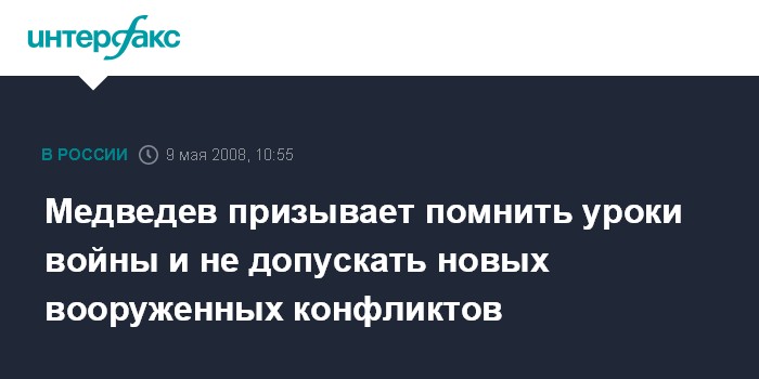 "История мировых войн предупреждает: вооруженные конфликты не рождаются сами по себе, их поджигают те, чьи безответственные амбиции берут верх над интересами стран и целых континентов, над интересами миллионов людей. И потому мы должны помнить уроки той войны, каждый день делать так, чтобы такие трагедии не повторялись", - заявил Д.Медведев, выступая в пятницу на Красной площади в Москве в ходе парада в честь 63-й годовщины Победы в Великой Отечественной войне.