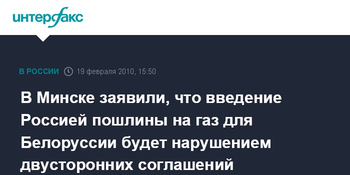 Москва. 19 февраля. INTERFAX.RU - Введение пошлины на поставляемый в Белоруссию российский газ будет являться прямым нарушением действующих между сторонами соглашений, заявил заместитель директора департамента внешнеэкономической деятельности МИД Белоруссии Антон Кудасов в пятницу на заседании "круглого стола" в Минске.