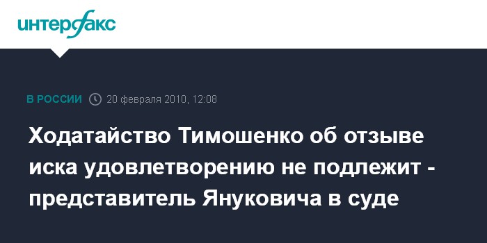 "Мы считаем, что суд должен быть продолжен, и ходатайство (Ю.Тимошенко об отзыве иска - ИФ) удовлетворению не подлежит", - -заявил представитель интересов В.Януковича в суде первый вице-спикер парламента Александр Лавринович журналистам в перерыве заседания ВАСУ в субботу.