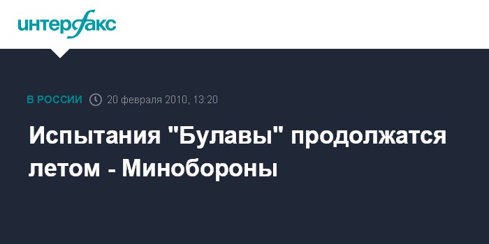 Москва. 20 февраля. INTERFAX.RU - Испытания стратегической ракеты морского базирования "Булава" продолжатся летом, сообщил в субботу начальник вооружения ВС РФ - заместитель министра обороны Владимир Поповкин. "У нас есть время до лета этого года. Делается все, чтобы максимально уменьшить риски (при испытаниях - "ИФ-АВН")", - сказал В.Поповкин в эфире радиостанции "Эхо Москвы".