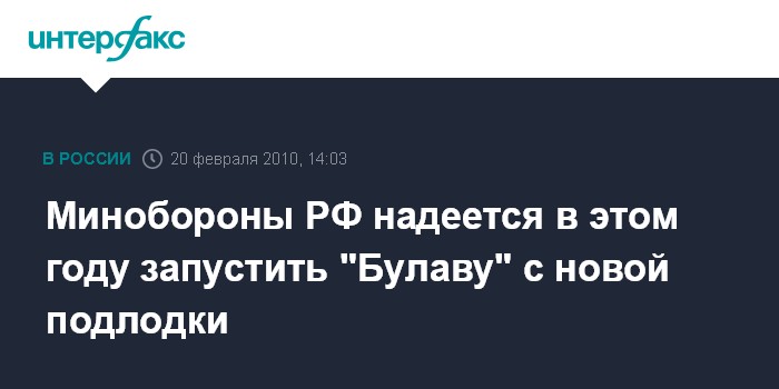Москва. 20 февраля. INTERFAX.RU - В Минобороны РФ рассчитывают в 2010 году осуществить первые пуски "Булавы" с нового подводного крейсера, сообщил в субботу начальник вооружения Вооруженных сил - заместитель министра обороны РФ Владимир Поповкин. "Пока мы пускали со старого крейсера. В этом году только перейдем на новый", - сказал В.Поповкин в эфире радиостанции "Эхо Москвы". Он напомнил, что для ракеты "Булава" строится новый крейсер. "Крейсер проходит свой цикл испытаний", - сказал В.Поповкин.