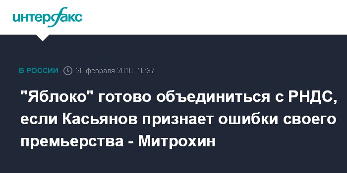 Москва. 20 февраля. INTERFAX.RU - Говорить об объединении партии "Яблоко" с Российским народно-демократическим союзом (РНДС) можно будет лишь после того, как лидер этой организации Михаил Касьянов признает свои ошибки в период его работы в правительстве, заявил лидер "Яблока" Сергей Митрохин.