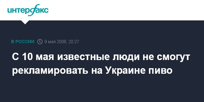 Киев. 9 мая. ИНТЕРФАКС-УКРАИНА - С 10 мая 2008 года на Украине будет запрещено изображать популярных лиц в рекламе пива или напитков, изготовленных на его основе.