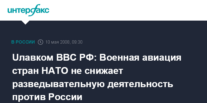 Москва. 10 мая. ИНТЕРФАКС-АВН - Самолеты военной авиации стран НАТО продолжают выполнять разведывательные полеты вблизи границ России, сообщил журналистам главнокомандующий Военно-воздушными силами генерал- полковник Александр Зелин.