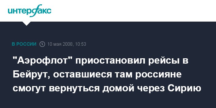 Москва. 10 мая. ИНТЕРФАКС - Авиакомпания "Аэрофлот - Российские авиалинии", выполнявшая дважды в неделю полеты в Бейрут, приостановила их в пятницу в связи с военными действиями, сообщила "Интерфаксу" руководитель пресс-службы авиакомпании Ирина Данненберг.