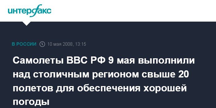 Москва. 10 мая. ИНТЕРФАКС-АВН - Специальные самолеты из состава Военно-воздушных сил России в течение суток выполнили над столичным регионом 21 вылет для разгона облаков, сообщил в субботу "Интерфаксу-АВН" помощник главкома ВВС России полковник Александр Дробышевский.