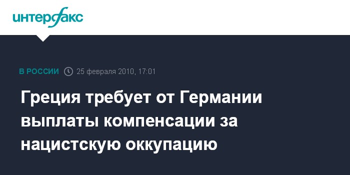 Москва. 25 февраля. IFX-NEWS - Афины заявили, что могут поставить перед Германией вопрос о выплате компенсации за оккупацию Греции нацистами в 1941 году. Берлин эти притязания уже отверг.
