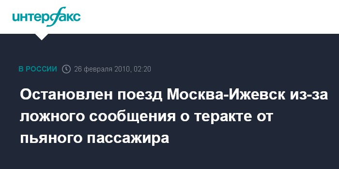 Москва. 26 февраля. ИНТЕРФАКС - В Подмосковье в одном километре от станции Куровская из-за ложного сообщения о возможном террористическом акте был остановлен поезд Москва-Ижевск.