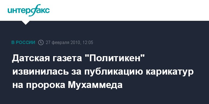 Москва. 27 февраля. INTERFAX.RU - Датская газета "Политикен" принесла извинения за возможное оскорбление, которое могла вызвать перепечатка карикатур на пророка Мухаммеда в 2008 г., сообщает в субботу британская телерадиокорпорация BBC. "Мы приносим извинения каждому, кто был оскорблен нашим решением перепечатать этот рисунок", - заявил главный редактор "Политикен" Тогер Сейденфаден.