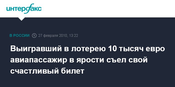 Мужчина, летевший из Польши в один из провинциальных британских аэропортов, приобрел лотерейный билет в самолете и обнаружил, что его выигрыш составляет 10 тыс евро. Он предъявил билет бортпроводникам и потребовал немедленной выплаты причитающихся ему денег, в чем ему было отказано. Разгневанный пассажир, имя которого авиакомпания не раскрывает, пригрозил, что в таком случае съест призовой билет.