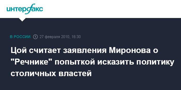 Москва. 27 февраля. INTERFAX.RU - Утверждения главы Совета Федерации Сергея Миронова о том, что правительство Москвы освобождает территорию "Речника" под строительство других объектов являются вымыслом, заявил "Интерфаксу" в субботу пресс-секретарь мэра столицы Сергей Цой. "К сожалению, предположения и утверждения господина Миронова иначе как безграмотными не назовешь - как с юридической, так и политической точек зрения", - сказал Цой. "Это попытка исказить политику московских властей по защите закона и сохранению экологии столицы", - подчеркнул он.