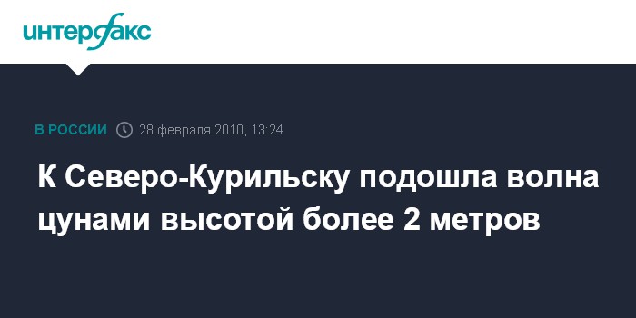 Южно-Сахалинск. 28 февраля. INTERFAX.RU - В Северо-Курильске (о. Парамушир) зафиксирована волна цунами высотой более 2 метров, сообщила агентству "Интерфакс - Дальний Восток" руководитель центра цунами управления Сахалингидрометслужбы Татьяна Ивельская.