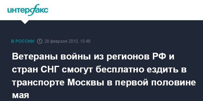 Москва. 28 февраля. INTERFAX.RU - По решению московских властей с 1 по 15 мая 2010 года все ветераны войны, прибывшие на празднование 65-летия Победы из регионов России и стран СНГ, смогут бесплатно пользоваться городским пассажирским транспортом. Как сообщил "Интерфаксу" источник в городской администрации, расходы на эти цели предусмотрены за счет городских бюджетных средств, предусмотренных для предоставления субсидий на социальную поддержку отдельных категорий граждан по оплате проезда на наземном пассажирском транспорте и московском метрополитене на 2010 год.