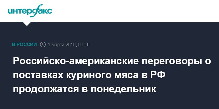 Москва. 1 марта. ИНТЕРФАКС - Второй раунд переговоров экспертов РФ и США по вопросу о поставках в Россию американского куриного мяса начинается в понедельник, 1 марта, в Москве.