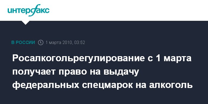 Москва. 1 марта. ИНТЕРФАКС - Федеральная служба по регулированию алкогольного рынка (Росалкогольрегулирование) с 1 марта 2010 года получает право на выдачу федеральных спецмарок для маркировки алкогольной продукции, производимой на территории РФ.