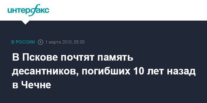Псков. 1 марта. ИНТЕРФАКС СЕВЕРО-ЗАПАД - В Пскове в понедельник пройдет День памяти десантников 6-й роты 104 полка 76-й десантно-штурмовой дивизии.