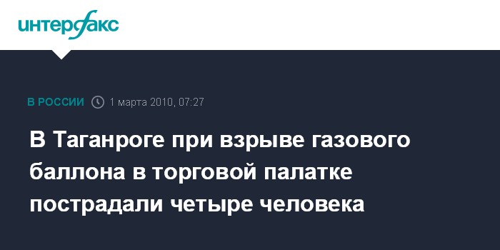 Таганрог. 1 марта. ИНТЕРФАКС-ЮГ - Газовый баллон взорвался в торговой палатке в Таганроге (Ростовская область), в результате чего ожоги получили четыре человека, сообщили "Интерфаксу" в понедельник в экстренных службах города.