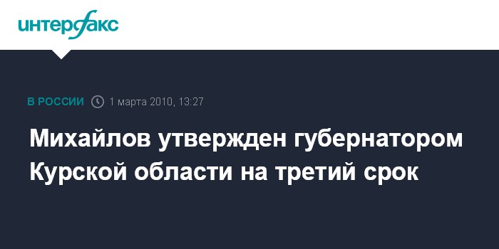 Москва. 1 марта. INTERFAX.RU - Курская областная дума на внеочередном заседании в понедельник утвердила кандидатуру действующего губернатора Александра Михайлова на должность главы региона, сообщили "Интерфаксу" в пресс-службе областной думы. По словам сотрудника пресс-службы, из 39 присутствовавших на заседании парламентариев кандидатуру Михайлова поддержали 35 депутатов, четыре депутата из фракции КПРФ проголосовали против.