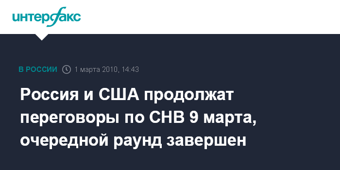 Москва. 1 марта. INTERFAX.RU - Делегации России и США завершили очередной раунд переговоров по новому договору о сокращении наступательных вооружений. "Российская делегация отбыла в минувшие выходные домой. Это можно назвать и окончанием раунда, и технической и политической передышкой. 9 марта переговоры возобновятся", - сказали "Интерфаксу" в постпредстве РФ при отделении ООН и других международных организациях в Женеве.