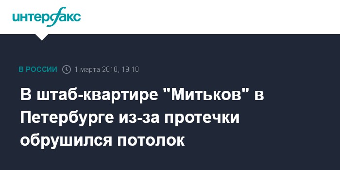 Москва. 1 марта. INTERFAX.RU - В штаб-квартире художественной группы "Митьки" в Петербурге от протечки обвалился потолок, рассказал "Интерфаксу" художник Дмитрий Шагин в понедельник. "Протекать с потолка начало в пятницу. А в субботу рухнул потолок размером где-то 4 на полтора метра. Обрушился и подвесной потолок, и штукатурка старая с лепниной. Обрушение повсюду, ощущение, будто бомба взорвалась в квартире", - сказал Шагин, добавив, что после обрушения вода сверху течь перестала. "Но этот дом в таком состоянии. Заливает все дальше со всех сторон, все течет. Сейчас вот позвонили, сказали, что снизу канализационные трубы прорвало", - посетовал художник. По его словам, в коммунальных службах города уже отозвались на сообщение об аварии. Д.Шагин в ближайшее время ждет специалистов для осмотра квартиры и составления акта обследования помещения.