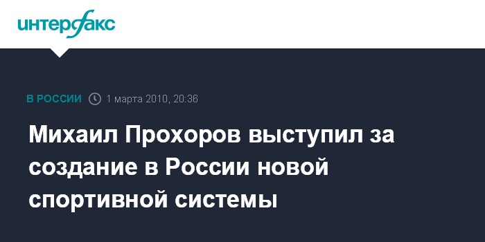 Москва. 1 марта. INTERFAX.RU - Глава группы "Онэксим" Михаил Прохоров, который присутствовал на Олимпиаде в Ванкувере, заявил в своем блоге в LiveJournal, что, по его мнению, не стоит искать виноватых в неудачном выступлении на Играх российской сборной. "Не надо играть в любимую российскую игру – поиски виновных. На это у нас обычно все силы и уходят, а дело остается там, где и раньше. Простая замена одних людей другими ничего не даст. Мы это не раз уже проходили. Это может иметь эффект только вместе с изменением системы спорта в целом. Развитие спорта должно стать приоритетом для страны, как это было в СССР, но советская спортивная система уже устарела и в "чистом" виде не подходит под реалии рыночной экономики", - отметил Прохоров.