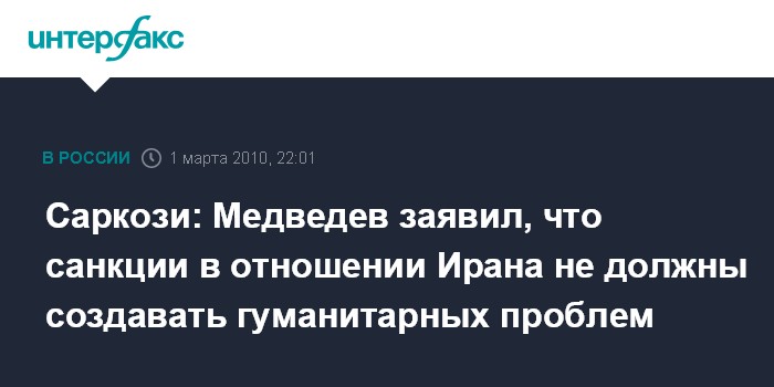 Саркози: Медведев заявил, что санкции в отношении Ирана не должны создавать гуманитарных проблем