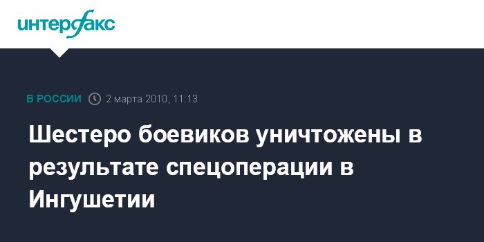 Москва. 2 марта. INTERFAX.RU - В ходе спецоперации в селении Экажево Назрановского района Ингушетии, по предварительным данным, уничтожено шесть боевиков. "Боестолкновение в селении Экажево продолжается. Имеются данные о шести убитых боевиках. По предварительной информации, ранены пятеро сотрудников правоохранительных органов", - сообщили агентству Интерфакс-Юг в штабе Объединенной группировки войск на Северном Кавказе.