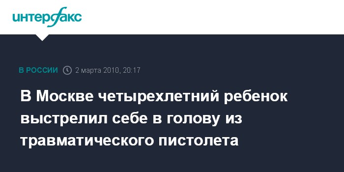 Москва. 2 марта. INTERFAX.RU - В Морозовскую больницу доставлен в критическом состоянии с огнестрельным ранением головы четырехлетний житель Москвы.