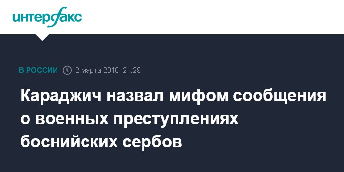 Белград. 2 марта. INTERFAX.RU - "Ложным мифом" назвал во вторник на процессе в Международном трибунале по бывшей Югославии бывший политический лидер боснийских сербов Радован Караджич историю о массовых убийствах в Сребренице, сообщает сербская независимая радиостанция Б92.