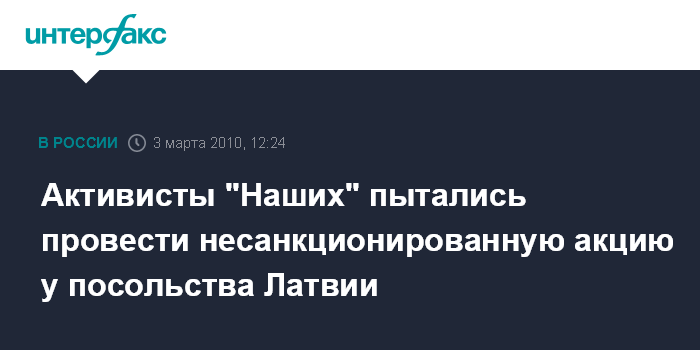 Москва. 3 марта. INTERFAX.RU - Активистов "Наших", которые пытались провести несанкционированную акцию около посольства Латвии, задержали в Москве, заявляют представители молодежного движения. "Более 50 активистов движения "Наши" вышли в среду на акцию к посольству Латвии, чтобы потребовать от латвийских властей обратить внимание на очередной вопиющий случай нарушения прав наших соотечественников, проживающих в Латвии", - сообщил "Интерфаксу" руководитель пресс-службы движения "Наши" Кристина Потупчик. По ее словам, сотрудники милиции задержали семь человек, в настоящее время они доставлены в УВД района "Басманный". "Интерфакс" не располагает комментариями по этому поводу из правоохранительных органов.