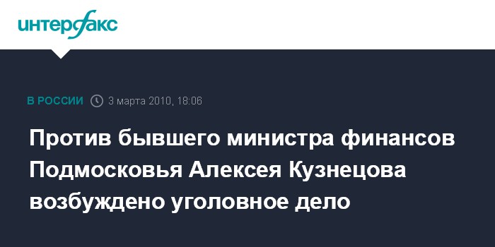 Москва. 3 марта. INTERFAX.RU - Возбуждено уголовное дело в отношении бывшего министра финансов Московской области Алексея Кузнецова и его партнеров, которые подозреваются в нанесении ущерба бюджету Подмосковья на сумму 27 млрд рублей, сообщил "Интерфаксу" источник в силовых структурах в среду.