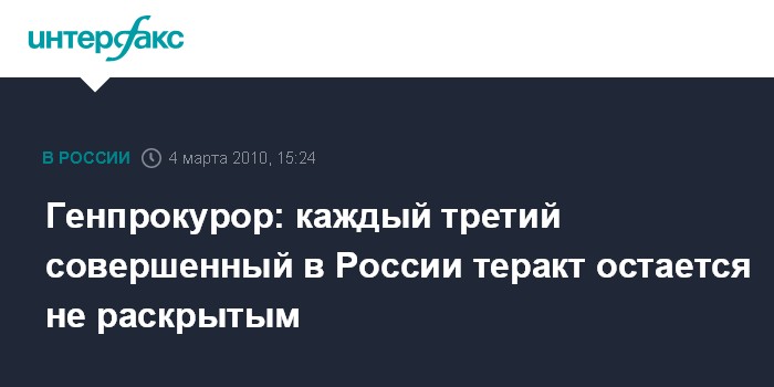 Москва. 4 марта. INTERFAX.RU - Генеральный прокурор России Юрий Чайка считает недостаточной работу следственных органов по раскрытию преступлений террористической направленности. "Не раскрыто треть преступлений террористической направленности. Не установлены виновники тринадцати террористических актов", - заявил Ю.Чайка в четверг на заседании расширенной коллегии Генпрокуратуры РФ. Генпрокурор подчеркнул, что в числе нераскрытых есть теракты, имеющие большой общественный резонанс, в частности, подрыв "Невского экспресса".