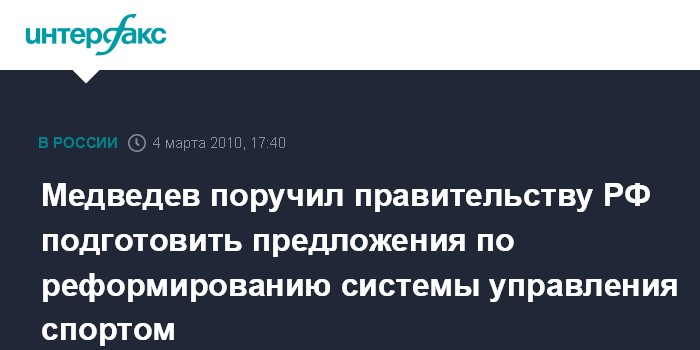 Москва. 4 марта. INTERFAX.RU - Президент РФ Дмитрий Медведев ждет от правительства и спортивных федераций предложений по реформированию системы управления российским спортом. "Президент поручил правительству РФ совместно со спортивными федерациями, которые являются общественными организациями, в ближайшее время обсудить сложившуюся ситуацию и подготовить ему предложения по реформированию системы управления российским спортом", - сообщила журналистам в четверг пресс-секретарь главы государства Наталья Тимакова.