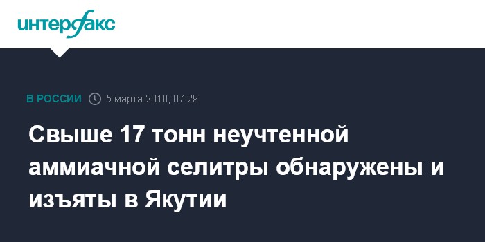 Якутск. 5 марта. ИНТЕРФАКС-ДАЛЬНИЙ ВОСТОК - Более 17 тонн аммиачной селитры, числящихся как израсходованные на производство взрыва, изъяты в ходе плановой проверки на одном из горнодобывающих предприятий Якутии, сообщает МВД по республике.