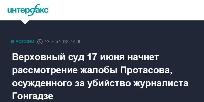 Киев. 12 мая. INTERFAX.RU - Верховный суд Украины приступит к рассмотрению кассационной жалобы Николая Протасова, осужденного за убийство журналиста Георгия Гонгадзе, 17 июня этого года. Об этом сообщил в понедельник журналистам адвокат Протасова Виктор Чевгуз.