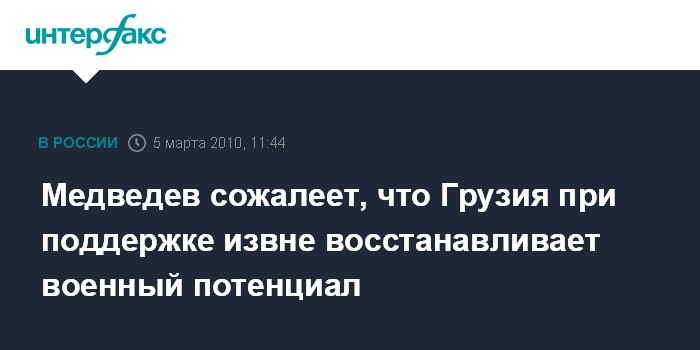 Москва. 5 марта. INTERFAX.RU - Военный потенциал Грузии продолжает восстанавливаться при поддержке извне, утверждает президент РФ Дмитрий Медведев. "К сожалению, продолжает восстанавливаться военный потенциал Грузии, причем при помощи военной поддержки извне", - сказал он в пятницу на заседании коллегии Минобороны.