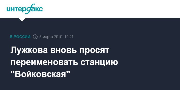 Москва. 5 марта. ИНТЕРФАКС - Участники церковно-общественного проекта "Возвращение" обратились к мэру Москвы Юрию Лужкову с просьбой содействовать переименованию станции метро "Войковская".
