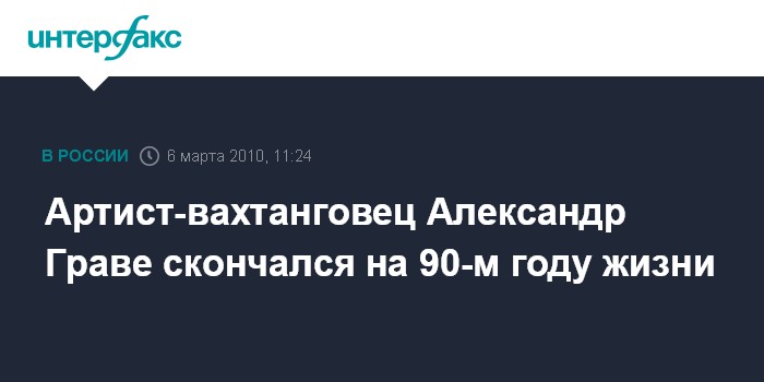 "Сегодня пришла скорбная весть. На 90-м году скончался народный артист России Александр Константинович Граве. Вахтанговцы скорбят о невосполнимой утрате и выражают глубокие соболезнования родным и близким", - сказал собеседник агентства.
