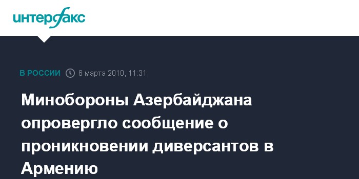 Баку. 6 марта. INTERFAX.RU - Министерство обороны Азербайджана опровергло сообщение о вторжении азербайджанской диверсионной группы на территорию Армении. Пресс-служба Минобороны охарактеризовало сообщение, распространенное накануне армянскими СМИ, как "ложь".