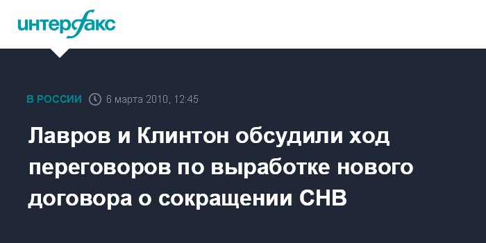 "4 марта состоялся телефонный разговор министра иностранных дел РФ С.Лаврова с государственным секретарем США Х.Клинтон. Были затронуты актуальные темы двустороннего стратегического диалога, связанные с выработкой нового договора о сокращении стратегических наступательных вооружений", - говорится в сообщении российского внешнеполитического ведомства, размещенного в субботу на сайте МИД РФ.