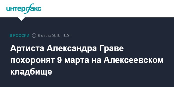 Москва. 6 марта. INTERFAX.RU - Народного артиста России Александра Граве, скончавшегося на 90-м году жизни в Москве в пятницу, похоронят 9 марта на Алексеевском кладбище, сообщили "Интерфаксу" в театре Вахтангова. "Отпевание состоится 9 марта в 11:30 в храме Спаса Преображения на Песках (Спасопесковский пер., 4а). Гражданская панихида в театре имени Евгения Вахтангова - в 12:30", - рассказал собеседник агентства в субботу. Он добавил, что похоронят актера на Алексеевском кладбище.