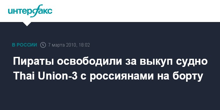 Москва. 7 марта. INTERFAX.RU - Сомалийские пираты в воскресенье утром освободили тунцелов Thai Union-3, на борту которого находятся 23 россиянина, сообщает интернет-издание "Морской бюллетень". Пираты освободили судно, получив выкуп, который был "очень значительным", причем сами сомалийцы воспринимают его не столько как выкуп, а как штраф за лов рыбы в водах Сомали, говорится в сообщении. Пираты захватили Thai Union-3 29 октября 2009 года в Индийском океане.