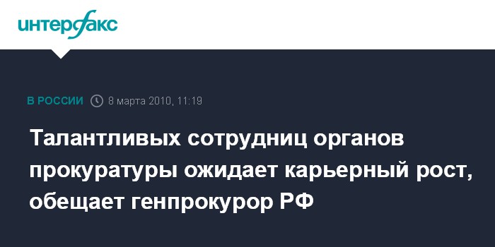 Москва. 8 марта. INTERFAX.RU - Для талантливых, профессиональных сотрудниц органов прокуратуры открыты пути к должностному росту, заверяет генпрокурор РФ Юрий Чайка в поздравлении по случаю Международного женского дня.