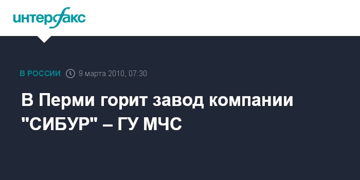 Пермь. 9 марта. ИНТЕРФАКС-ПОВОЛЖЬЕ - В Перми, на заводе ЗАО "СИБУР-химпром", который входит в "СИБУР холдинг", во вторник возникло возгорание установки по производству этилбензола, сообщили агентству "Интерфакс-Поволжье" в пресс-службе ГУ МЧС по Пермскому краю.