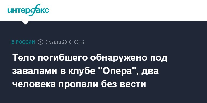 Москва. 9 марта. INTERFAX.RU - Под завалами сгоревшего московского клуба "Опера" найдено тело погибшего мужчины, сообщил "Интерфаксу" начальник пресс-службы ГУ МЧС по Москве Евгений Бобылев. "В ходе разбора завалов, пожарными обнаружено тело погибшего, предположительно это охранник клуба",- сказал Бобылев. Он добавил, что работы по разбору завалов продолжаются.