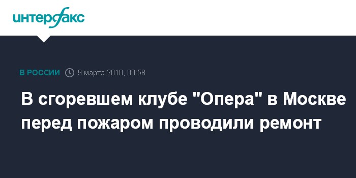 Москва. 9 марта. INTERFAX.RU - Сильному пожару, возникшему минувшей ночью в клубе "Опера" на Трехгорном валу, дом 6, предшествовал ремонт, сообщили "Интерфаксу" в пресс-службе ГУ МЧС по Москве во вторник. "По предварительным данным, в здании проводились строительные работы", - рассказали в пресс-службе.