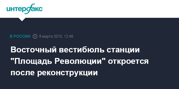 Москва. 9 марта. INTERFAX.RU - В конце марта восточный вестибюль станции "Площадь революции" (выход к Богоявленскому переулку и Никольской улице) будет открыт после реконструкции. Как сообщает пресс-служба Московского метрополитена, работы в вестибюле велись с декабря 2008 года.