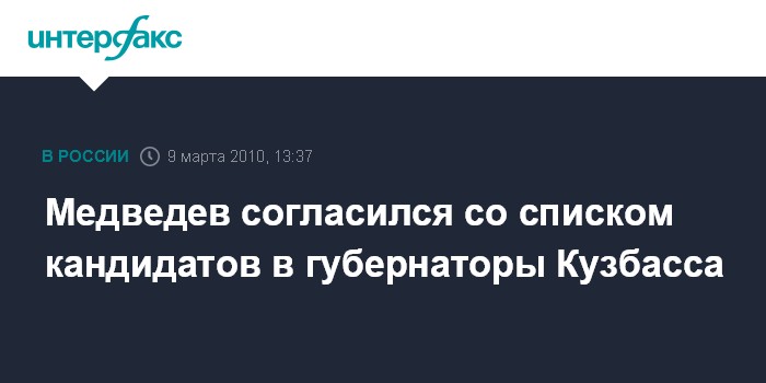 Москва. 9 марта. INTERFAX.RU - Дмитрий Медведев согласился со списком кандидатур, предложенных партией "Единая Россия" на должность губернатора Кемеровской области, сообщила пресс-служба Кремля.